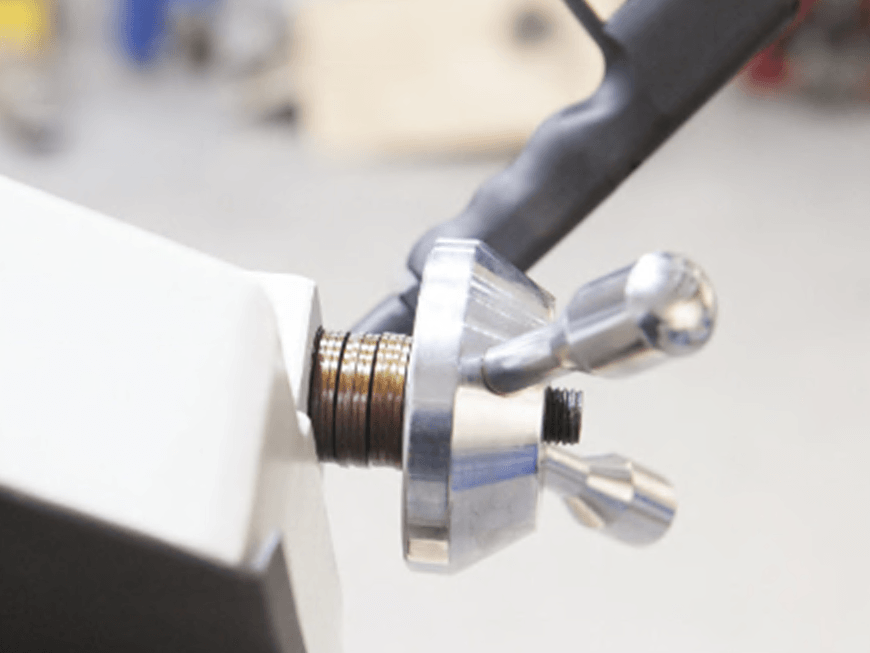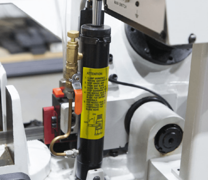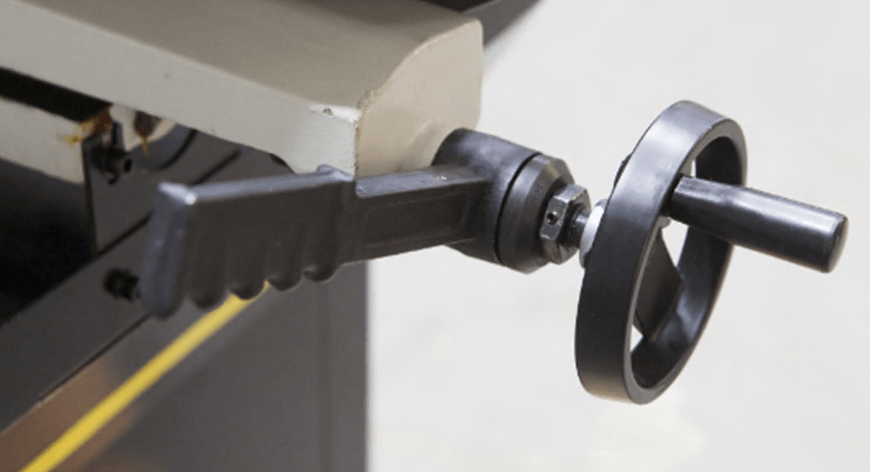 На станках с гидроразгрузкой управление и процесс резки (запуск пилы – опускание рамы – остановка пилы) происходит за счёт запуска двигателя и регулировки гидроцилиндра. Гидроцилиндр имеет переключатель вкл./выкл. гидравлической системы и плавную регулировку опускания рамы верхним маховиком на дроссельном клапане. Предназначен для регулировки и снижения скорости опускания рамы.