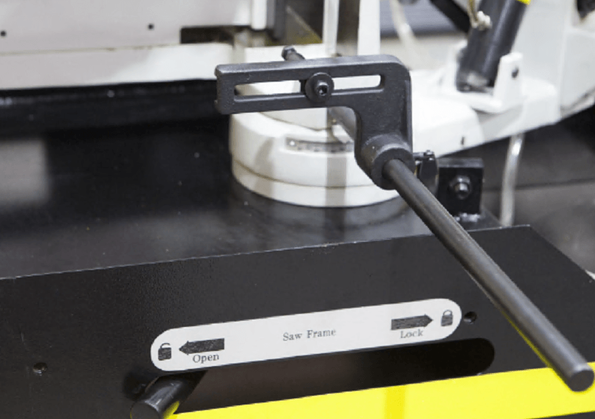 Панель управления Зубчатый привод Неподвижные механические тиски Рычаг доводки тисков Механическое натяжение полотна Помпа СОЖ Гидроцилиндр Мерный упор 500 мм Рычаг фиксации поворота рамы |