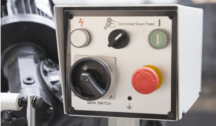 - Индикатор включения станка - Переключатель режима работы (автоматическое и с контролем подачи вниз) - Кнопка включения станка - Переключатель скорости резания и выключения станка - Общая кнопка стоп