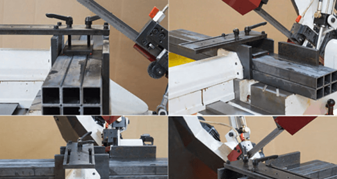 Используя данную модель, имеющую быстро регулируемые тиски для резки под углом, поворачивается рама, а не заготовка. Тиски с системой быстрого отвода ускоряют процесс смены заготовки (ускоренный отвод подвижной губки происходит без вращения маховика). Зажим заготовки осуществляется тисками вручную, подача заготовки - также вручную. Наличие системы СОЖ в стандартной комплектации позволяет добиться высокой производительности. Станок предназначен для обработки большого количества металла, данная модель находит широкое применение в серийном и мелкосерийном производстве.